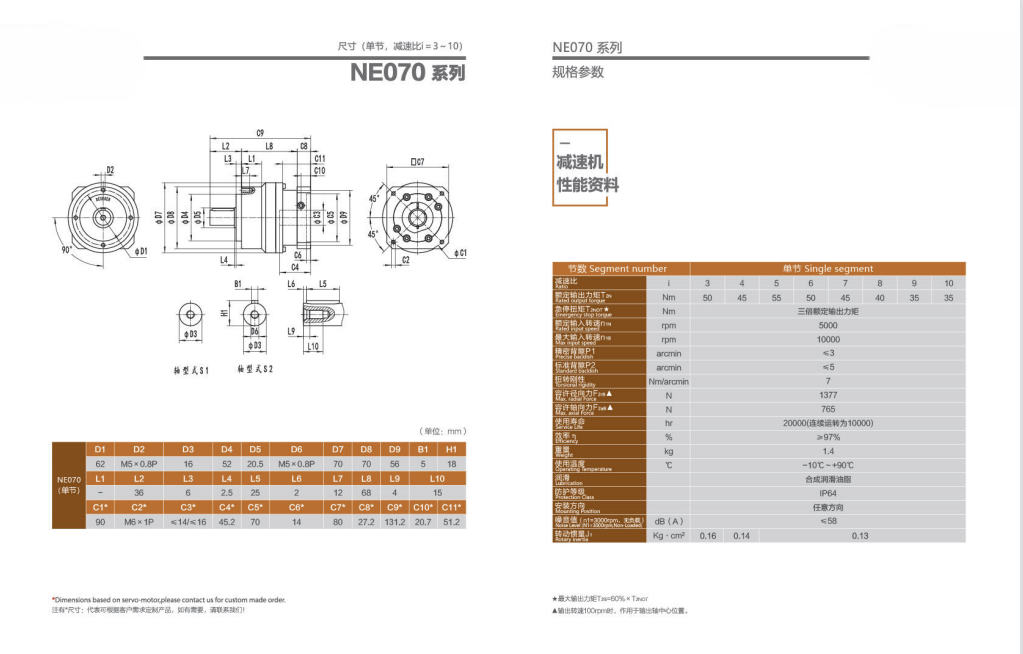 NE070系列超精密背隙行星減速機系列(P0): NE070系列精密背隙行星減速器系列(P1): NE070系列標準背隙行星減速機系列(P2):