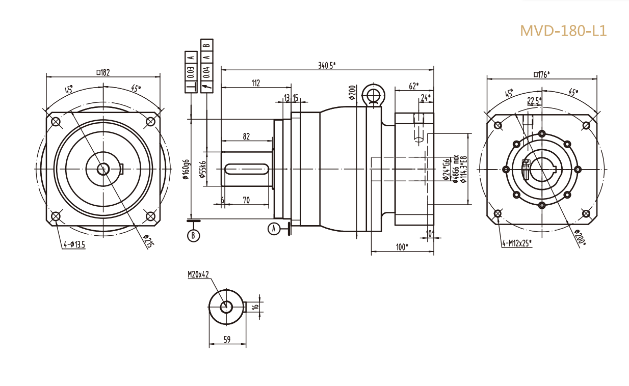 然后,根據(jù)負(fù)載扭矩和減速比,查閱 MVD-180-L1 系列減速器的選型手冊(cè),選擇能夠滿足要求的型號(hào),假設(shè)選定型號(hào)為 MVD-180-L1-10。