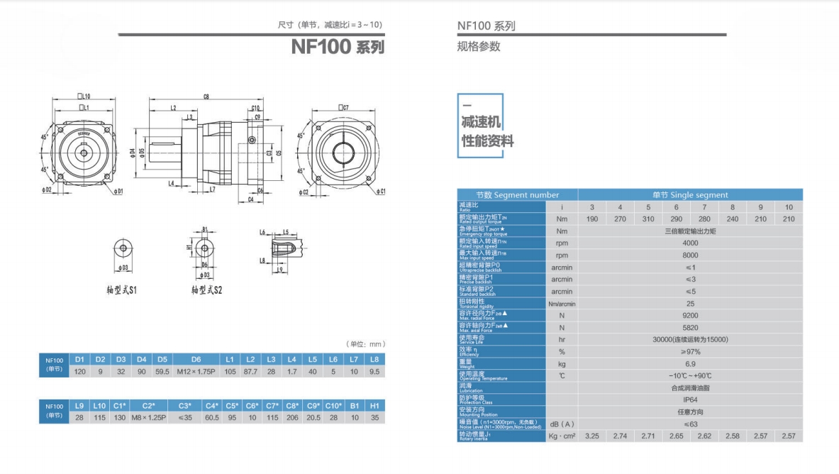 NF100系列超精密背隙行星減速機系列(P0): NF100系列精密背隙行星減速器系列(P1): NF100系列標準背隙行星減速機系列(P2):