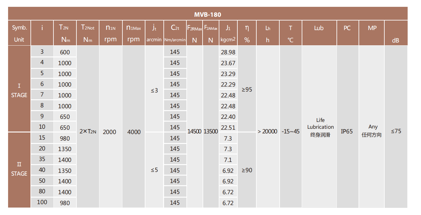 MVB-180-L1系列超精密背隙行星減速機系列(P0): MVB-180-L1系列精密背隙行星減速器系列(P1): MVB-180-L1系列標準背隙行星減速機系列(P2):