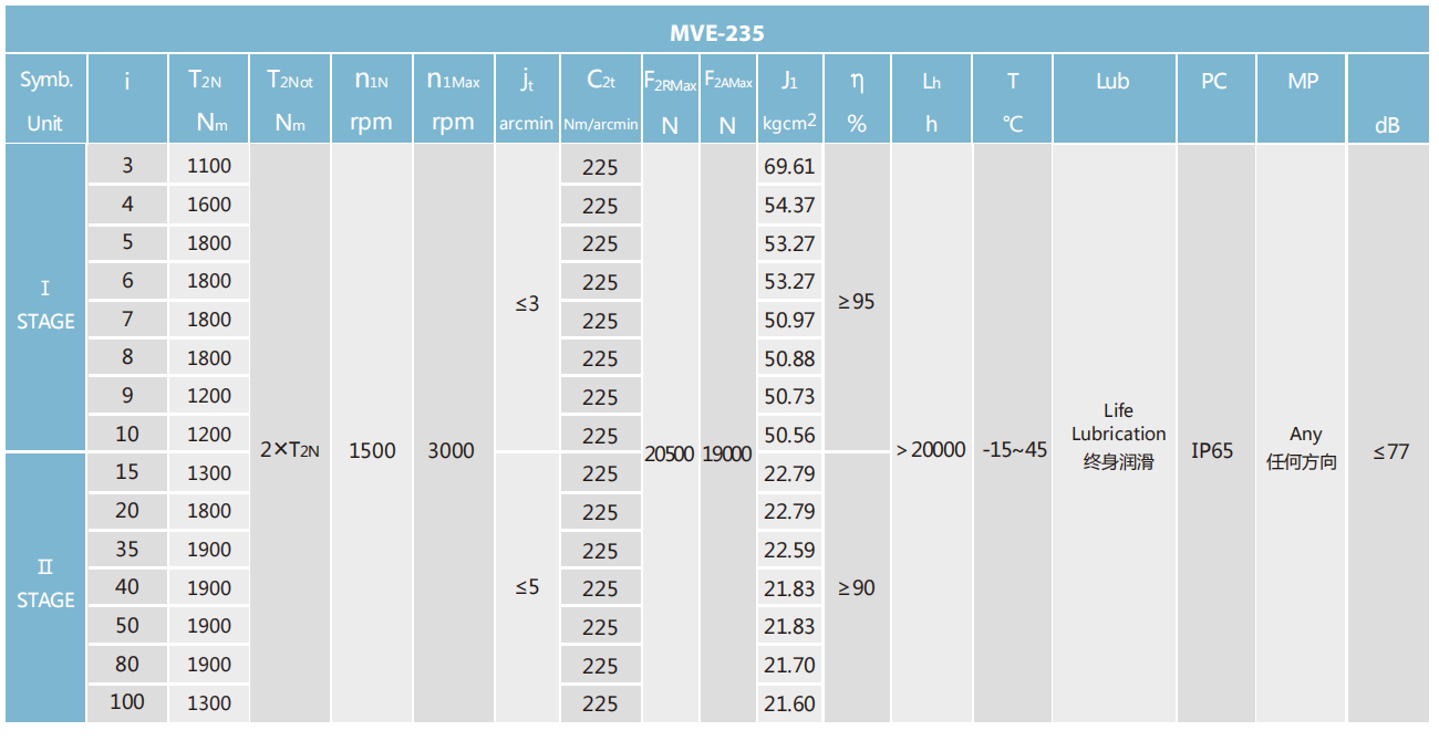 MVE-235-L2系列超精密背隙行星減速機(jī)系列(P0): MVE-235-L2系列精密背隙行星減速器系列(P1): MVE-235-L2系列標(biāo)準(zhǔn)背隙行星減速機(jī)系列(P2):