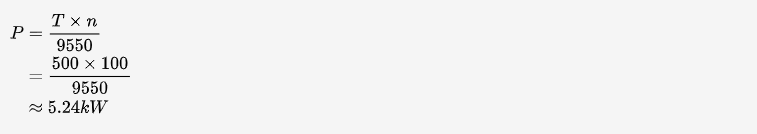 例如,某設(shè)備需要輸出扭矩為 500 N·m,輸出轉(zhuǎn)速為 100 r/min,則所需的功率為: